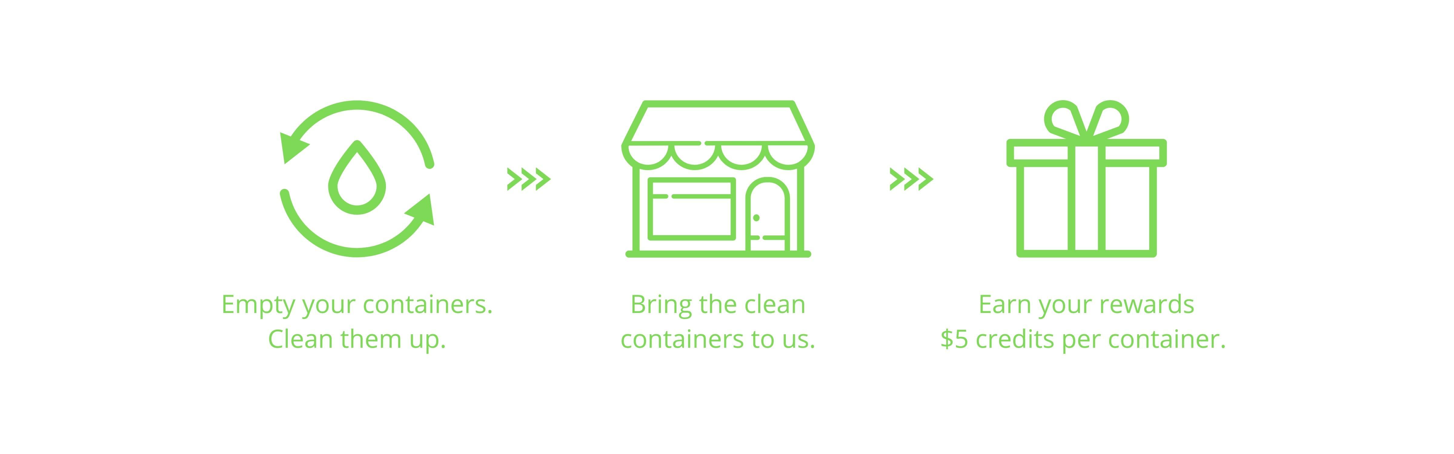 Gather your empties and bring them to our Central shop. $5 credits will be given for each bottle returned. Credits can be spent immediately or on your next purchase with us.